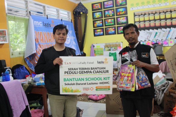 Hasil donasi tersebut kemudian disalurkan kepada penerima manfaat dalam bentuk peralatan sekolah atau School Kit. Relawan di lapangan, Sani Sonjaya yang juga merupakan Manajer Regional Lazismu Wilayah Jawa Barat mengatakan bahwa lokasi penyaluran berada di Kampung Ciputri, Ciherang, Kecamatan Pacet. Di lokasi ini Lazismu dan Muhammadiyah Disaster Management Center (MDMC) telah mendirikan sekolah darurat untuk para penyintas anak-anak.