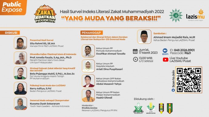 Dalam rangka menyemarakkan Ramadhan 1444 H, Lazismu PP Muhammadiyah menggelar EDUZISKA, salah satunya adalah "Diskusi Hasil Survei Indeks Literasi Zakat Generasi Muda Muhammadiyah 2022" yang dirancang sebagai alat sosialisasi dan edukasi pentingnya meningkatkan literasi zakat Generasi Muda Muhammadiyah. Diskusi dengan tema "Yang Muda Yang Beraksi!" ini akan berlangsung secara daring pada Jumat, 17 Maret 2023 pukul 13.00 WIB sampai dengan selesai melalui aplikasi Zoom Meeting dan kanal Youtube Lazismu Pusat. Acara ini akan menghadirkan Sita Rahmi BS (Manajer R&D Lazismu PP Muhammadiyah), Amelia Fauzia (Peneliti Filantropi Islam/Guru Besar UIN Syarif Hidayatullah), Beta Pujangga Mukti (Dai Muda/Anggota Majelis Tabligh PP Muhammadiyah), Barry Aditya (Badan Pengurus Lazismu PP Muhammadiyah), dan Kusuma Dyah Sekararum (Youth Leaders Ashoka Indonesia), serta sambutan dari Ahmad Imam Mujadid Rais (Ketua Badan Pengurus Lazismu PP Muhammadiyah).
