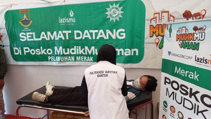 KOLABORASI DINAS KESEHATAN, POSKO MUDIKMU AMAN LAZISMU DI PELABUHAN MERAK LAYANI PEMUDIK YANG LELAH
