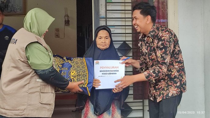 KOTA PEKANBARU -- Warga dhuafa di RT.05, RW.01, Kelurahan Pulau Karomah, Kecamatan Sukajadi, Kota Pekanbaru kini bersuka cita. Lazismu Kota Pekanbaru berbagi kebahagiaan pada bulan Ramadhan 1444 H dengan menyalurkan bantuan Kado Lebaran untuk lansia sebanyak 30 paket. Tidak hanya itu, 60 orang dhuafa yang tinggal di sana juga mendapatkan santunan.