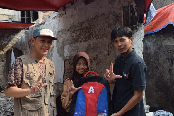 Secara simbolis, bantuan School Kit diserahkan kepada Julia yang ditemani Roinah mewakili RW 05 dan RW 07, disaksikan warga kedua RW tersebut. Desta dari Lazismu Wilayah DKI Jakarta juga turut mendampingi penyerahan bantuan ini. Julia mewakili warga penyintas menyampaikan terima kasih yang sebesar-besarnya kepada donatur Lazismu atas bantuan School Kit sehingga bisa meringankan beban mereka.