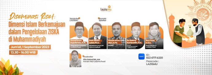 Kegiatan bertajuk Diseminasi Riset: Dimensi Islam Berkemajuan dalam Pengelolaan ZISKA di Muhammadiyah ini akan berlangsung pada Jumat, 1 September 2023 pukul 13.30-16.00 WIB secara daring melalui aplikasi Zoom. Sambutan akan disampaikan oleh Ahmad Imam Mujadid Rais,. M.IR (Ketua Badan Pengurus Lazismu PP Muhammadiyah), Keynote Speaker Prof. Hilman Latief, Ph.D. (Bendahara Umum PP Muhammadiyah), Fauzan Anwar Sandiah, M.Pd. (Peneliti Majelis Pembinaan Kader dan SDI PP Muhammadiyah), Dr. Dadang Syaripuddin, M.A. (Dewan Pengawas Syariah Lazismu PP Muhammadiyah), dan Ibnu Tsani, M.Sos. (Badan Pengurus Lazismu PP Muhammadiyah). Bertindak selaku Moderator adalah Sita Rahmi BS, M.A. (Manajer Divisi R&D Lazismu PP Muhammadiyah).