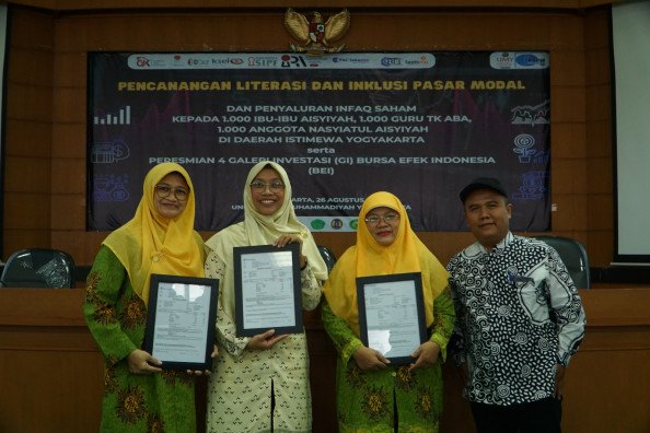 KOTA YOGYAKARTA -- Ada yang unik dalam acara Pencanangan Literasi dan Inklusi Pasar Modal serta Peresmian 4 Galeri Investasi (GI) Bursa Efek Indonesia (BEI). Pada kesempatan ini, Lazismu Wilayah DI Yogyakarta menyalurkan bantuan berupa lembaran saham dengan satuan lot kepada para penerima manfaat. Sebanyak tiga ribu lot saham syariah dibagikan, terdiri dari seribu lot kepada guru-guru TK ABA, seribu lot untuk anggota Aisyiyah, dan 1000 lot untuk anggota Nasyiatul Aisyiyah se-DI Yogyakarta.