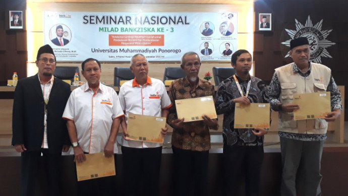 KABUPATEN PONOROGO -- Dalam rangka Milad ke-3, BankZiska menggelar Seminar Nasional dengan tema "Kolaborasi Lembaga Keuangan Syariah untuk Pembebasan Rentenir dan Pemberdayaan Masyarakat Miskin Ekstrem. Kegiatan ini berlangsung pada Sabtu (23/09) di Gedung Rektorat Universitas Muhammadiyah (Unmuh) Ponorogo, dihadiri oleh Bupati Kabupaten Ponorogo Sugiri Sancoko, Rektor Universitas Muhammadiyah Ponorogo Happy Susanto, Bendahara Pimpinan Wilayah Muhammadiyah (PWM) Jawa Timur Zainul Muslimin, Ketua Badan Pengurus Lazismu Wilayah Jawa Timur Imam Hambali, Ketua Pimpinan Daerah Muhammadiyah (PDM) Ponorogo Muhammad Syafrudin, serta Direktur Utama Banziska Agus Edi Sumanto.