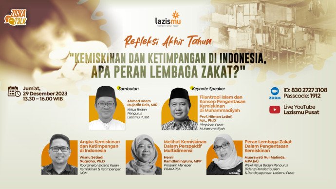 Lazismu Pimpinan Pusat (PP) Muhammadiyah akan menggelar diskusi Refleksi Akhir Tahun dengan tema "Kemiskinan dan Ketimpangan di Indonesia, Apa Peran Lembaga Zakat?" pada Jumat, 29 Desember 2023 pukul 13.30-16.00 WIB secara daring melalui aplikasi Zoom dan Youtube Lazismu Pusat. Acara ini akan menghadirkan Keynote Speaker Bendahara Umum PP Muhammadiyah Prof. Hilman Latief, M.A., Ph.D., dengan para pembicara yaitu Wisnu Setiadi Nugroho, Ph.D. (Koordinator Bidang Kajian Kemiskinan dan Ketimpangan UGM), Herni Ramdlaningrum, MPP (Program Manager PRAKARSA), Muarawati Nur Malinda, MPA (M) (Wakil Ketua Badan Pengurus Bidang Pendistribusian dan Pendayagunaan Lazismu PP Muhammadiyah), dan sambutan oleh Ahmad Imam Mujadid Rais, MIR (Ketua Badan Pengurus Lazismu PP Muhammadiyah).