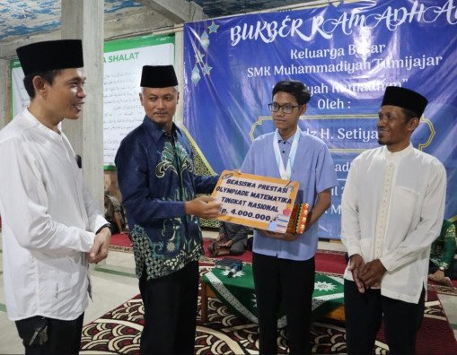 KABUPATEN TULANG BAWANG BARAT -- Bantuan berupa beasiswa pendidikan diberikan kepada Haidar Kadafi, siswa SMK Muhammadiyah Tumijajar, Kabupaten Tulang Bawang Barat, Lampung. Ia berhasil meraih medali emas dalam ajang Olympiade Ahmad Dahlan (OLYMPICAD) Nasional VII kategori Matematika yang diadakan di Kota Bandung bulan Maret lalu. Bantuan senilai 5 juta rupiah ini berasal dari Majelis Pendidikan Dasar Menengah (Dikdasmen) dan Pendidikan Non Formal (PNF) Pimpinan Daerah Muhammadiyah (PDM) Tulang Bawang Barat.