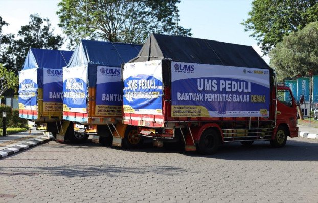 KOTA SURAKARTA -- Dalam rangka kepedulian terhadap banjir yang terjadi di Kabupaten Demak, Universitas Muhammadiyah Surakarta (UMS) Peduli menyalurkan bantuan kepada penyintas bencana tersebut berupa 1.500 paket yang diangkut dengan 3 armada truk bantuan logistik. Penyaluran bantuan ini dipimpin langsung oleh Prof. Dr. Sofyan Anif, M.Si. yang berangkat bersama tim UMS berangkat ke lokasi terdampak banjir dalam bentuk pengabdian masyarakat.