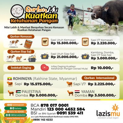 Lazismu Kota Langsa mematok harga biaya qurban 1 bagian lembu Rp. 2.400.000,- dan 1 ekor Kambing Rp. 2.500.000,-. Pendaftaran dan pembayaran tetap diterima sampai dengan tanggal 17 Juli 2021.