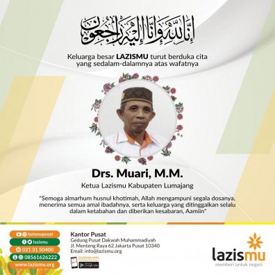LUMAJANG - Hari Selasa, (29/12), keluarga besar Lazismu se-Indonesia, khususnya Jawa Timur, dalam keadaan berduka cita dan merasa sangat kehilangan atas kepergian seorang pejuang Zakat. Beliau adalah Drs. Muari, MM, Ketua Badan Pengurus Lembaga Amil Zakat, Infaq dan Shodaqoh Muhammadiyah (Lazismu) Kabupaten Lumajang.