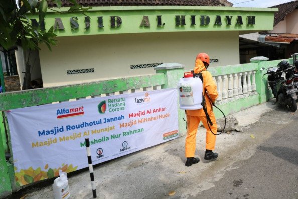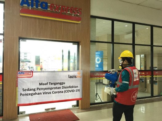 Alfamart dan Lazismu menerjunkan relawan kebencanaan. Sisi luar dan sisi dalam objek yang disemprot tak luput dari semprotan cairan disinfektan. Para relawan di lapangan mengenakan perangkat alat pelindung diri (APD).