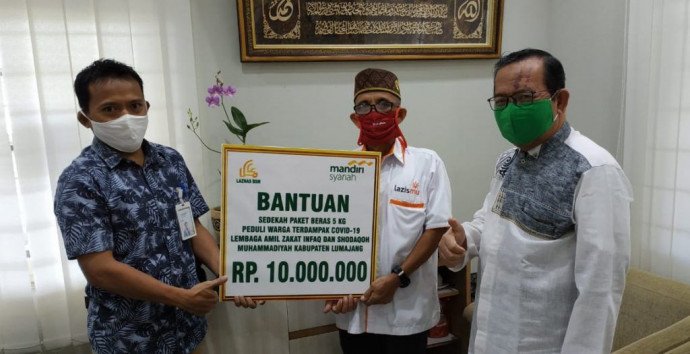 Serah terima bantuan dilakukan oleh Bapak Rawi mewakili YBM Bank Syariah Mandiri kepada Ketua Lazismu Lumajang Drs Muari beserta Ketua Pimpinan Daerah Muhammadiyah (PDM) Lumajang Suharyo AP di Kantor Bank Syariah Mandiri Jl Jendral S Parman Lumajang, Rabu, 20/05/2020.