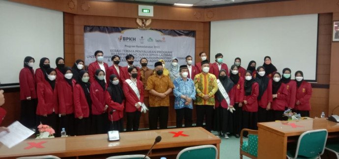 Acara yang berlangsung secara hybrid ini pun ditandai dengan serah terima bantuan program Beasiswa Sang Surya dari BPKH yang diwakili oleh Dr. Rahmat Hidayat, S.E., M.T. kepada Ketua Badan Pengurus Lazismu PP Muhammadiyah, Dr. Mahli Zainuddin Tago, M.Si. secara virtual. Serah terima ini dirangkai dengan penyerahan beasiswa secara simbolis kepada perwakilan penerima beasiswa dan penyematan Duta Haji.
